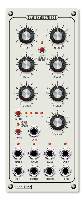 The HOLD stage adds "punch" to the attack portion of the envelope, simulating the effect that compression has on peak transients. This is the purported "Holy Grail" for getting that Moog envelope shape. HOLD coupled with the sub-millisecond attacks, gives the envelope more impact than a standard ADSR can produce. Programmable CV AMT control for each channel sets the depth of modulation effect on the envelope stage timing using a 0 to +5V range. The greater the voltage input the shorter the envelope.